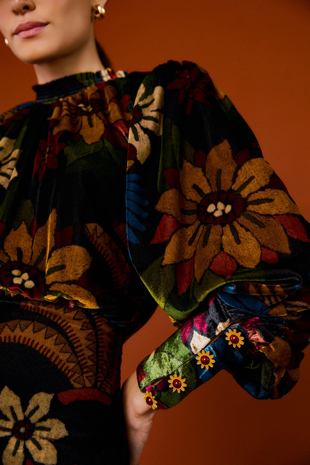 - Long sleeves with flower-shaped buttons