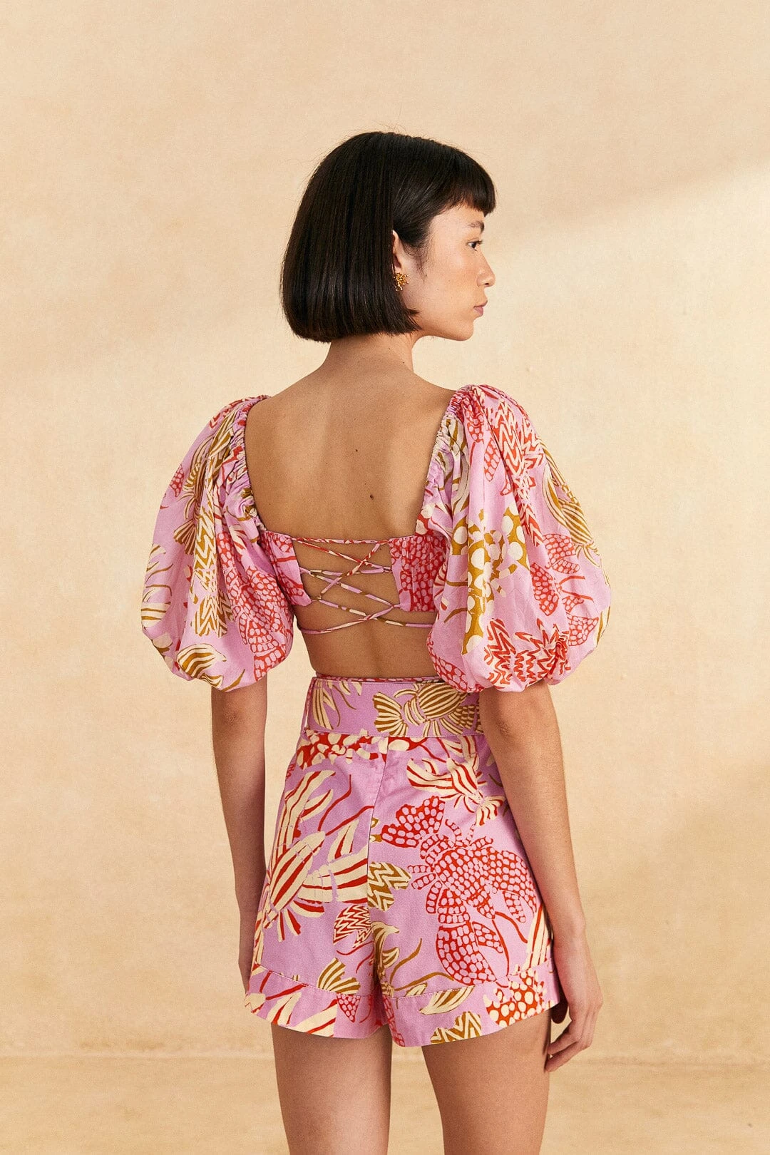 Straight from the bright sea to your solar wardrobe: the Pink Mixed Lobsters Top is a timeless pick to enjoy Summer on repeat! It features an easy-breezy silhouette with standout sleeves and ties to follow your bold moves in every place, every wear. All your bottoms are allowed to join this one-of-a-kind look, from solid pants to printed shorts (bet in the Pink Mixed Lobsters Shorts!), and you can also invite your fresh shoes and accessories to sun-shine all around.