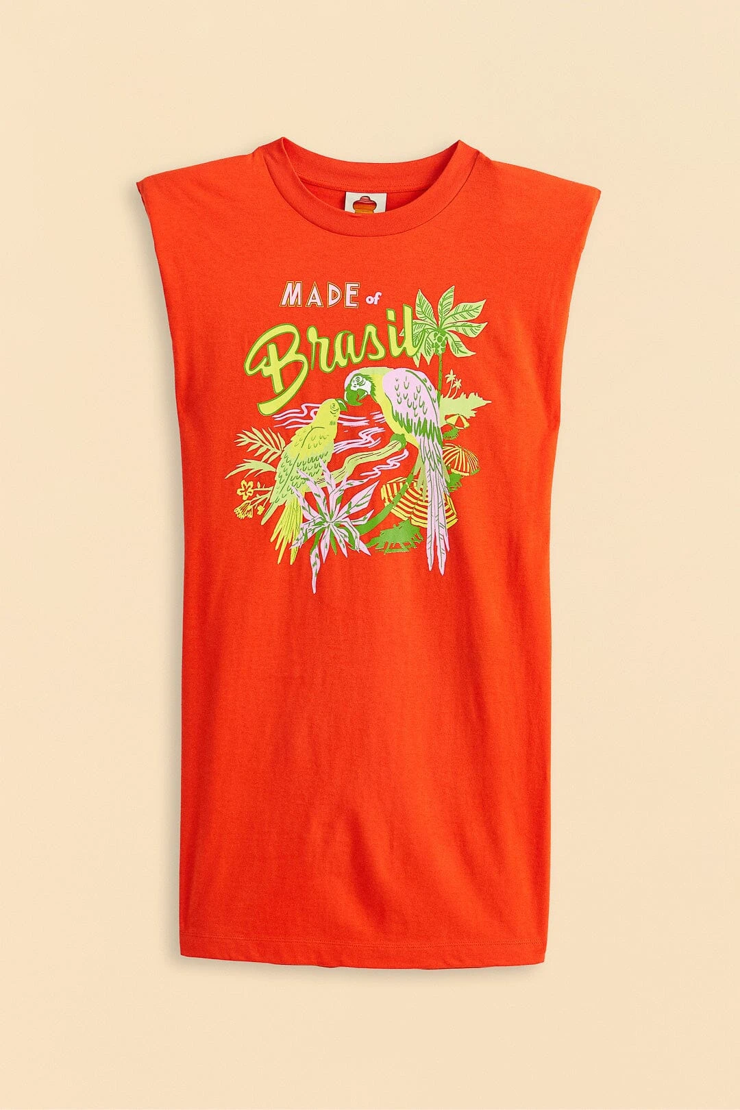Embody the exuberant energy of the season in a Summer-ready style. The Red Brasil Mini T-Shirt Dress brings the easiest silhouette with padded shoulders, a mini length to reintroduce your legs to solar days, and one of the statement-making prints of our new collection. For a chic-yet-cool look, you can put your sandals on or throw colorful sneakers for a fun vibe: either way, you’ll be effortlessly walking on the brightest side!