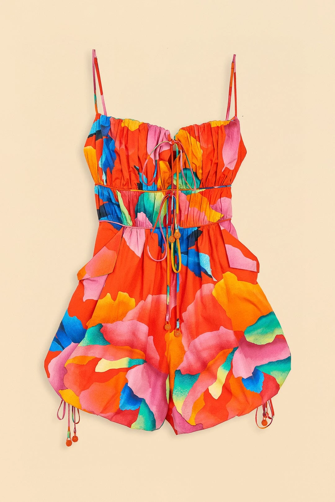 When Summer calls for tropical, breezy faves, you can answer in the Red Ombre Chita Organic Cotton Romper. It features a contemporary twist on a classic silhouette with ruched detailing, beaded tassels, and a mini length that goes with your solar flow. Your new one-piece matches your bold FARM Rio Shoes and accessories to effortlessly walk you through the season on the brightest side!